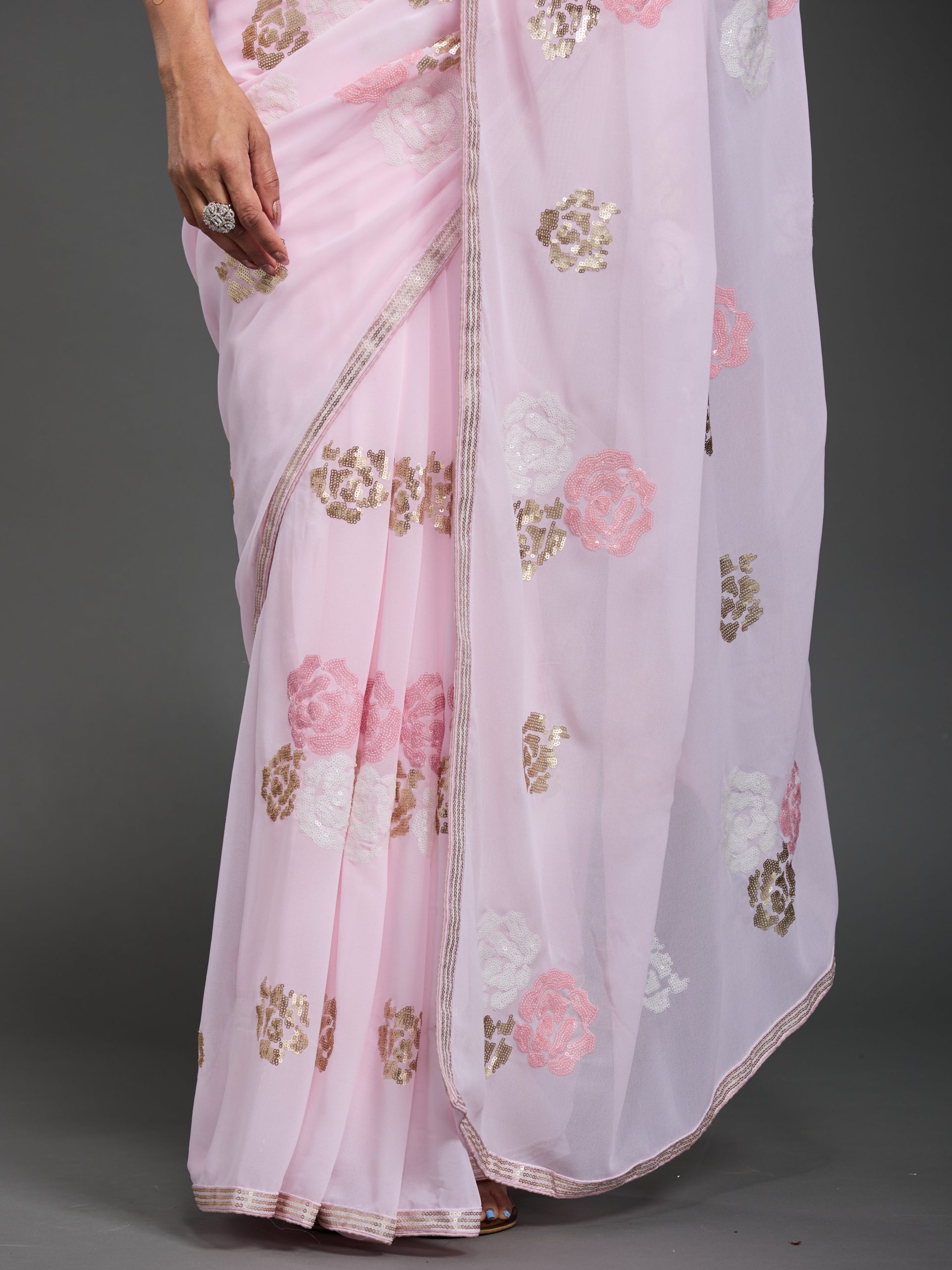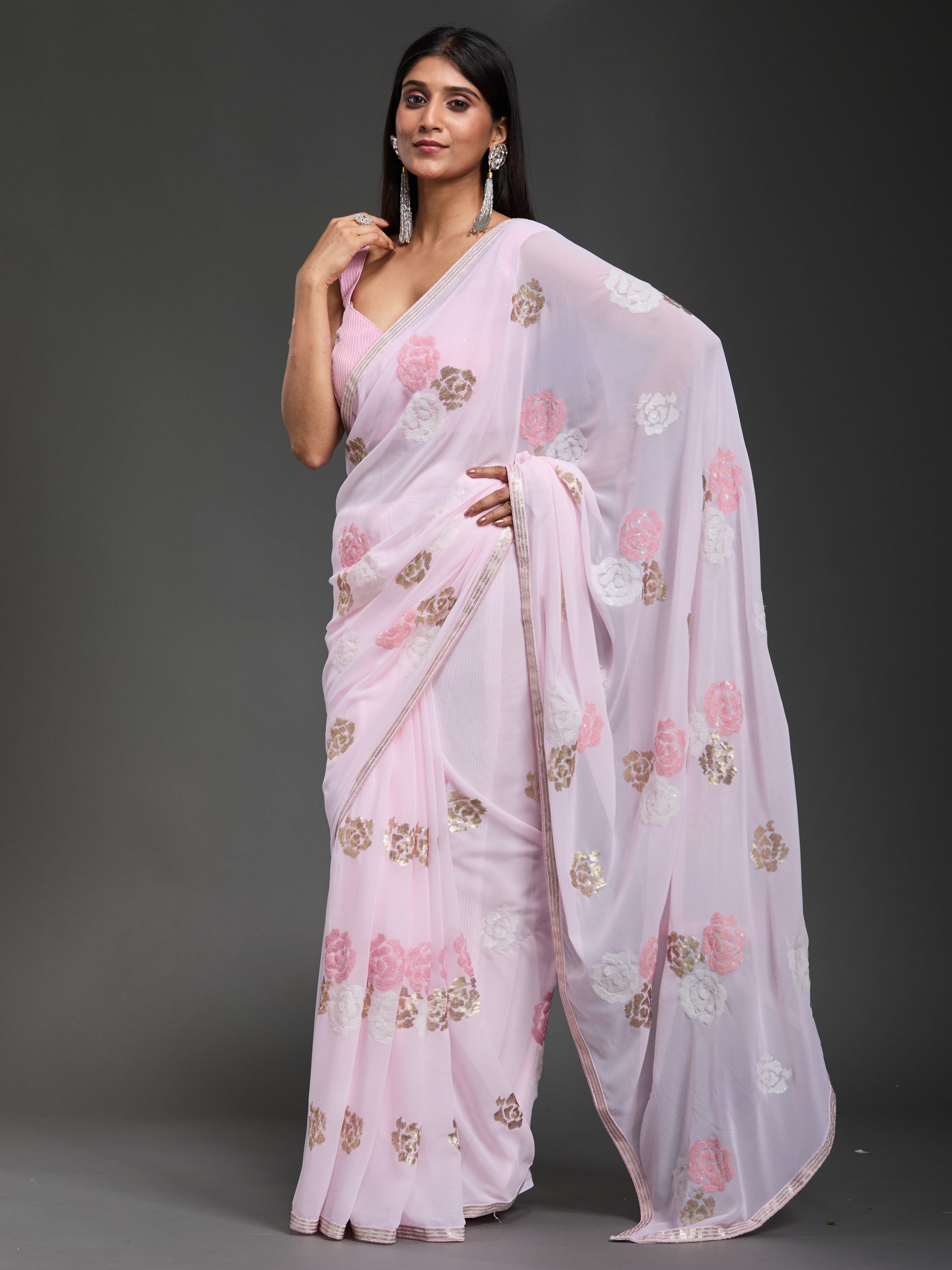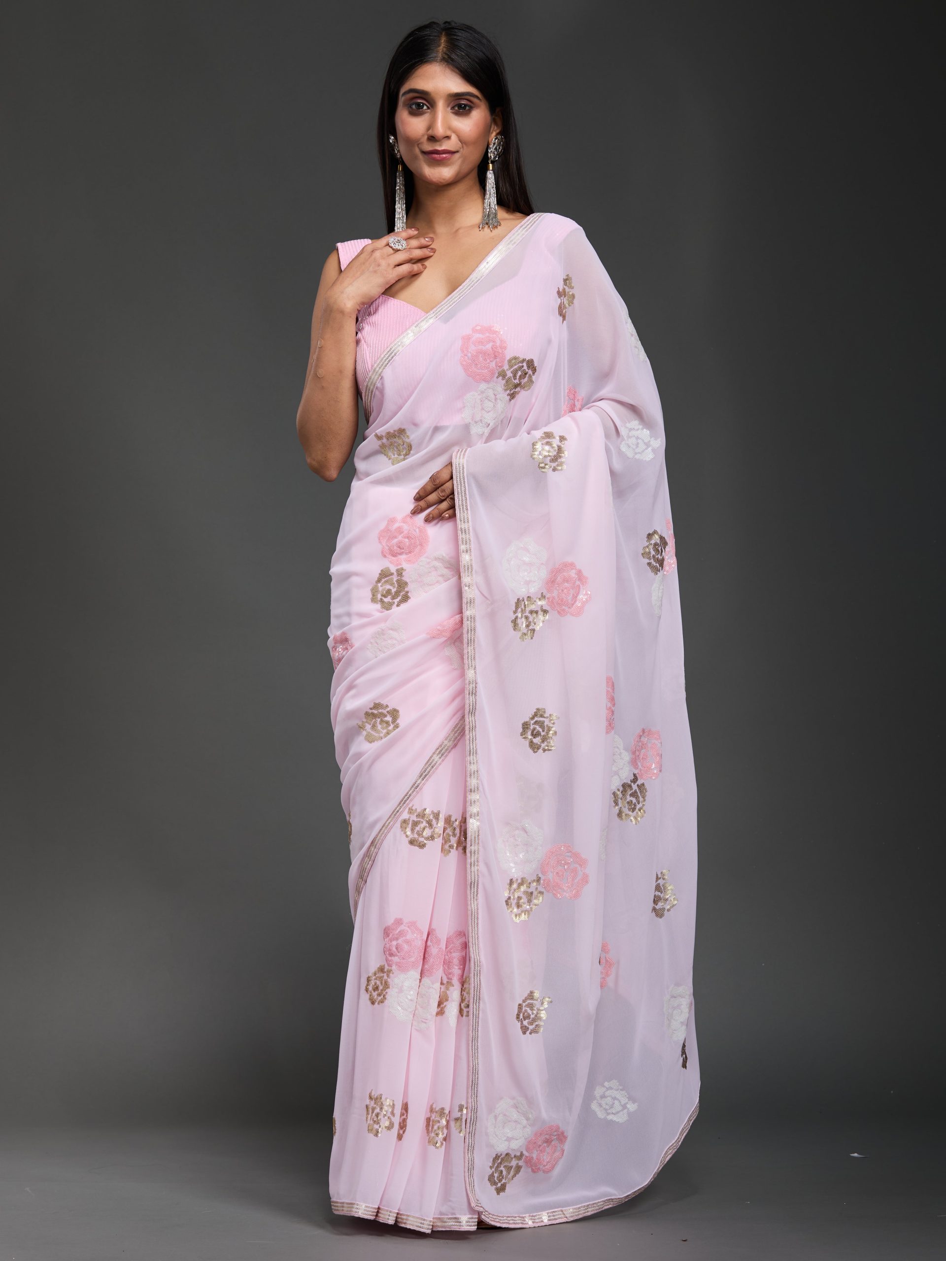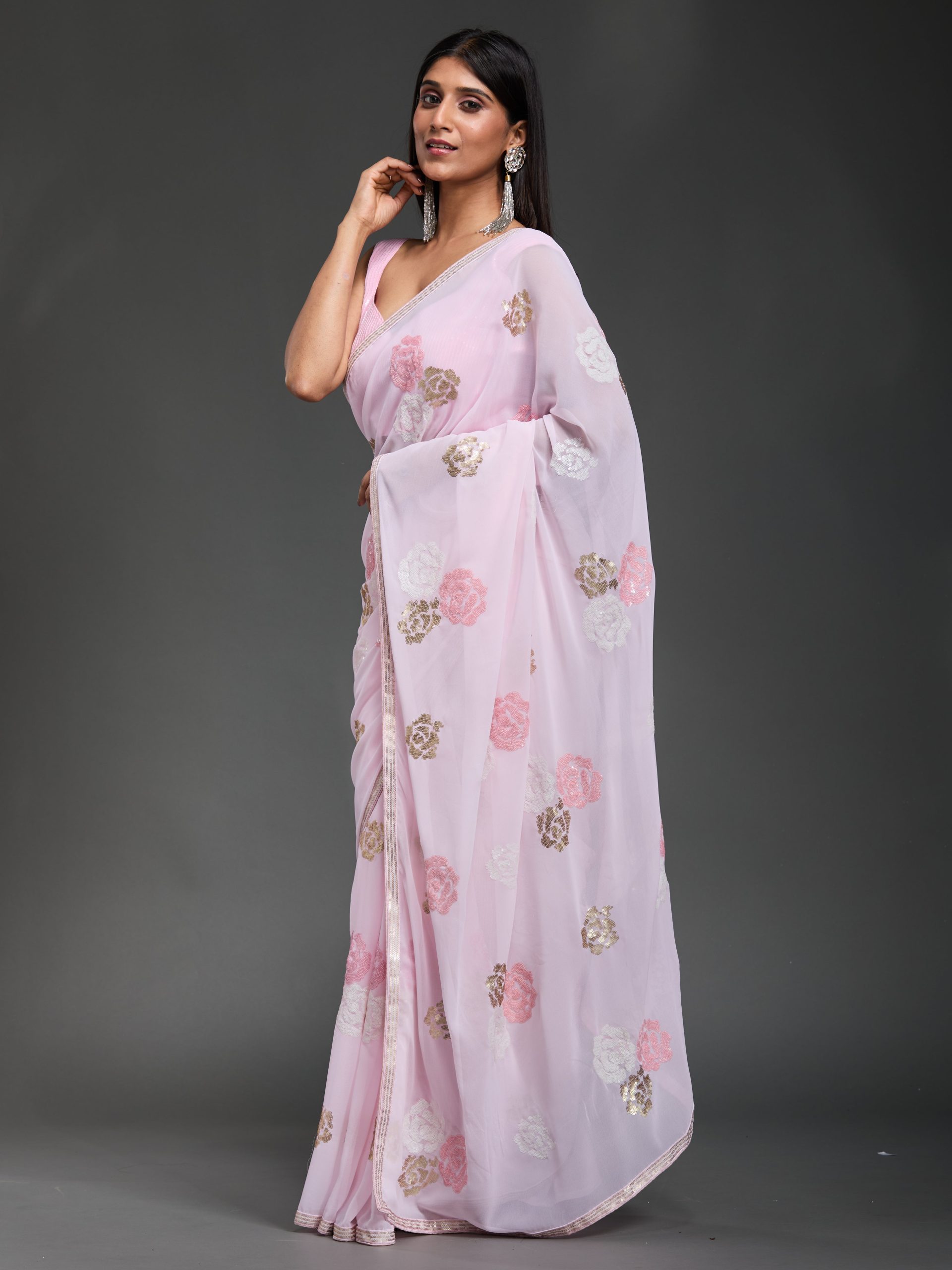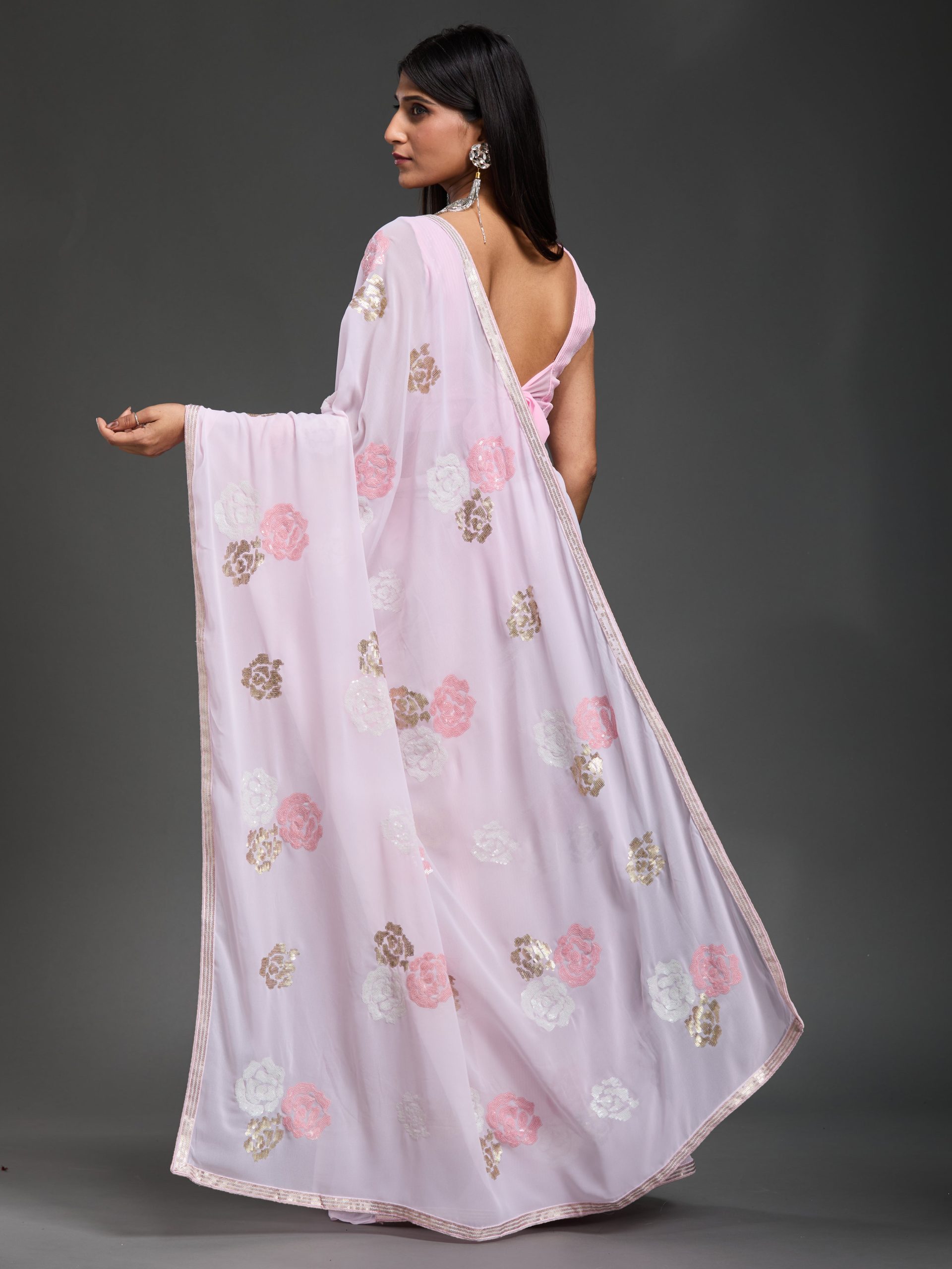 In a delicate dance of pink hues, this creation whispers elegance with every fold. The gentle shimmer of sequins captures the light, turning each movement into a graceful symphony of style.